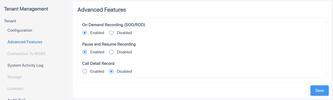 The Advanced Features tab lets you enable On Demand Recording features for the tenant service including Save-on-Demand (SOD), Record-on-Demand (ROD) and Pause and Resume functionality.