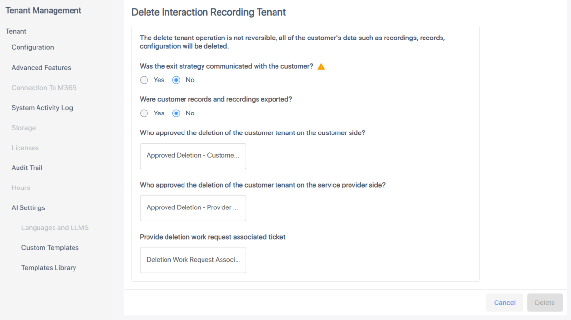 Who approved the deletion of the customer tenant on the customer side |