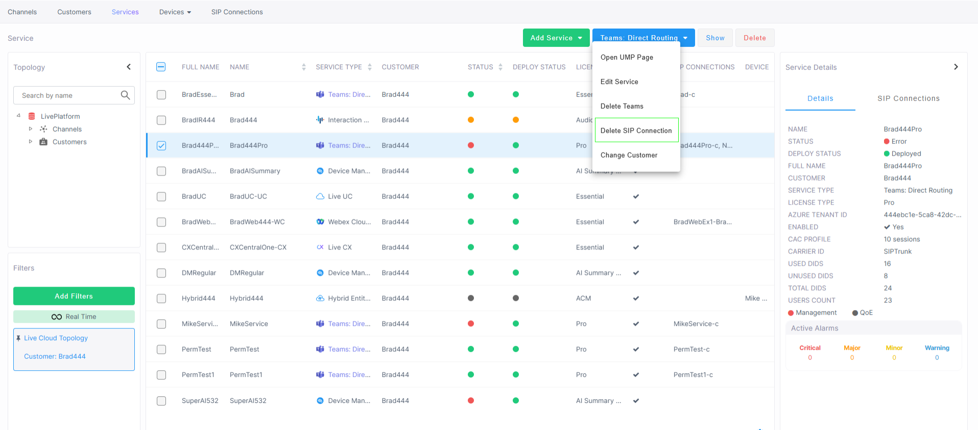 You can delete a SIP Connection that is attached to a Direct Routing service. This action deletes all Voice Quality and Call data that is associated with the connection.