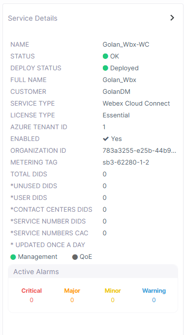 Summary of Active Alarms for the service (click to drill down to Service alarms). See Monitoring Alarms from Customer Service Sites.