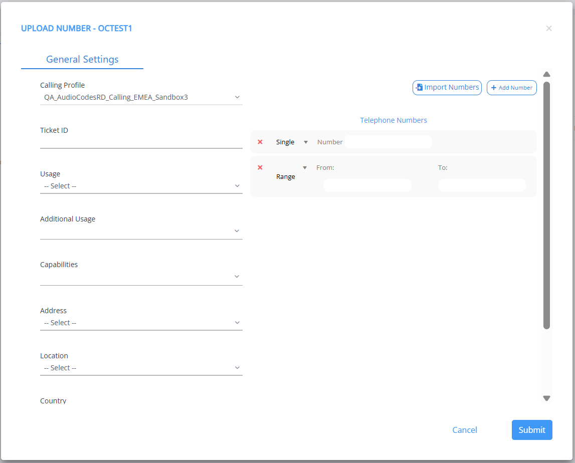 You can upload numbers to the customer tenant either by entering the numbers directly in the interface or by importing a list of numbers. Uploaded numbers are routed through configured SIP Connections that are attached to Calling Profile templates: