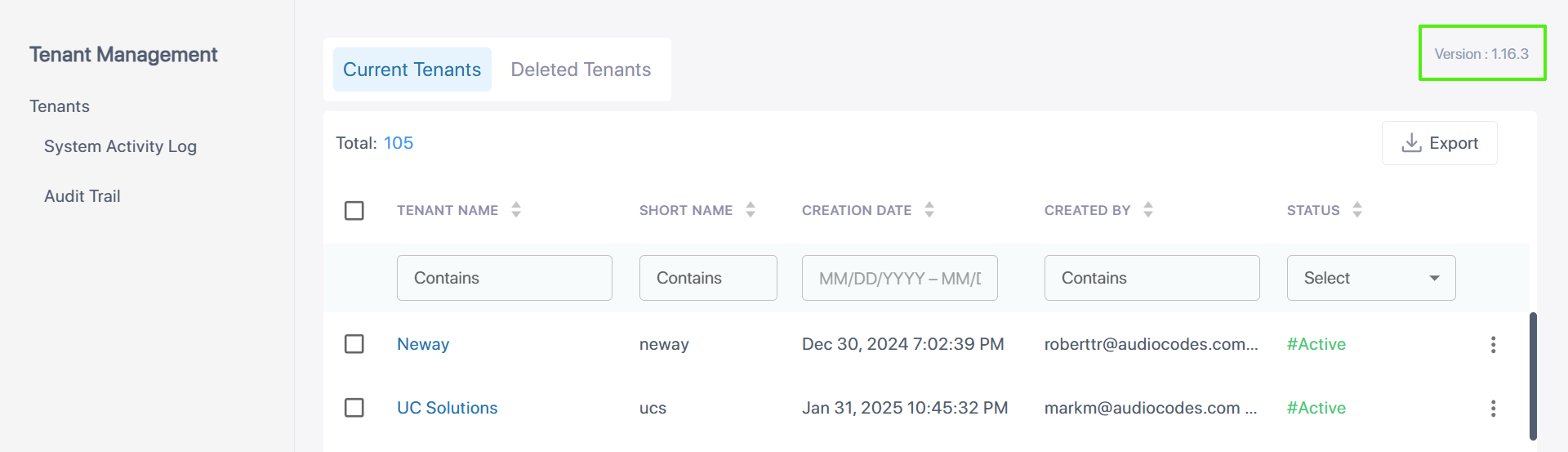 You can view the current software version of the Tenant Management module in the About window.