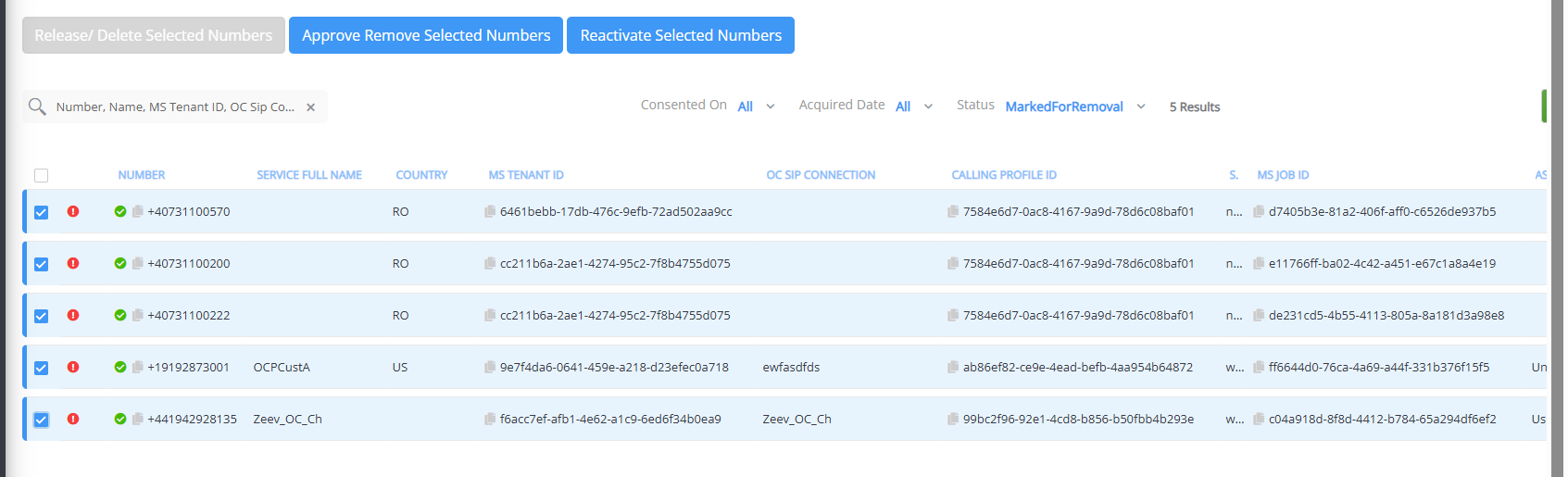 To filter the list of numbers by "Marked for Removal", from the Status drop-down list (located above the table), choose MarkedForRemoval. |