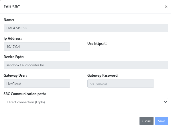 Connect to Live Platform server directly by configuring the FQDN Public IP address of the SBC device. After wyUpdate upgrade, the SBC communication path is automatically set to Direct connection (FQDN), which is received from Live Platform. |