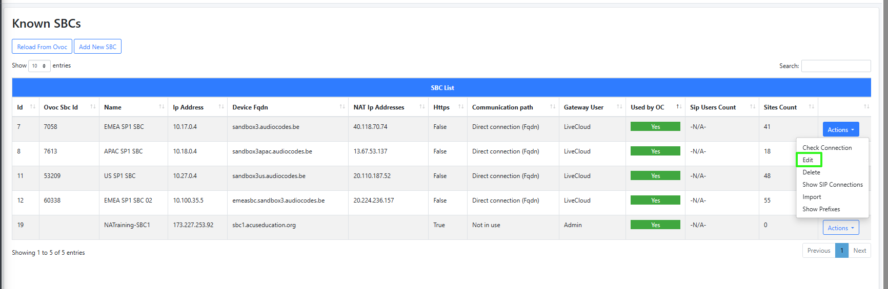 | 1. | In the Known SBCs page, select an SBC device, and then from the Actions drop-down, select Edit. |