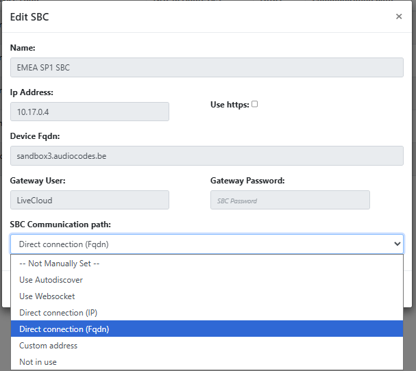 You can determine the method that is used by User Management Pack 365 to communicate with SBC devices including Autodiscovery, Websocket, direct connection or by using a custom address. Following the wyUpdate upgrade, the SBC communication path is automatically set to Direct connection (Fqdn).