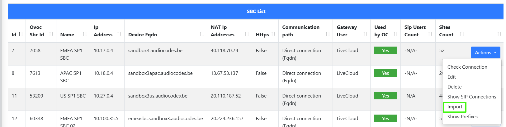 | 1. | In the Known SBCs page, select an SBC device, and then from the Actions drop-down, select Import. |