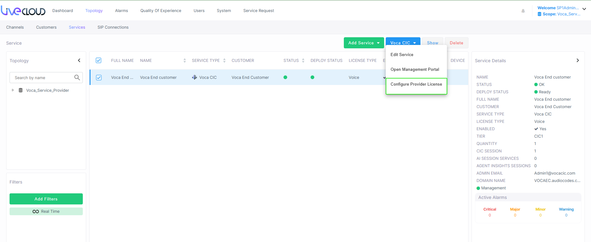 | 1. | From the Voca CIC drop-down, choose Configure Provider License. |