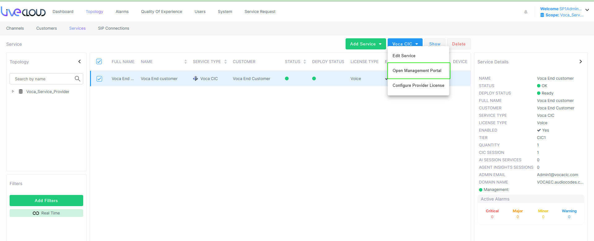 1. In the Services page, from the Voca CIC menu, choose Open Management Portal.