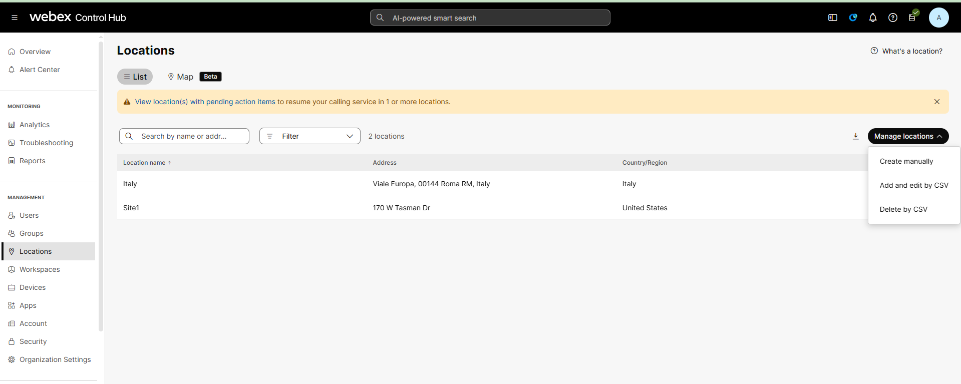 | 1. | On the Webex Control Hub, in the Navigation pane, select Locations. |