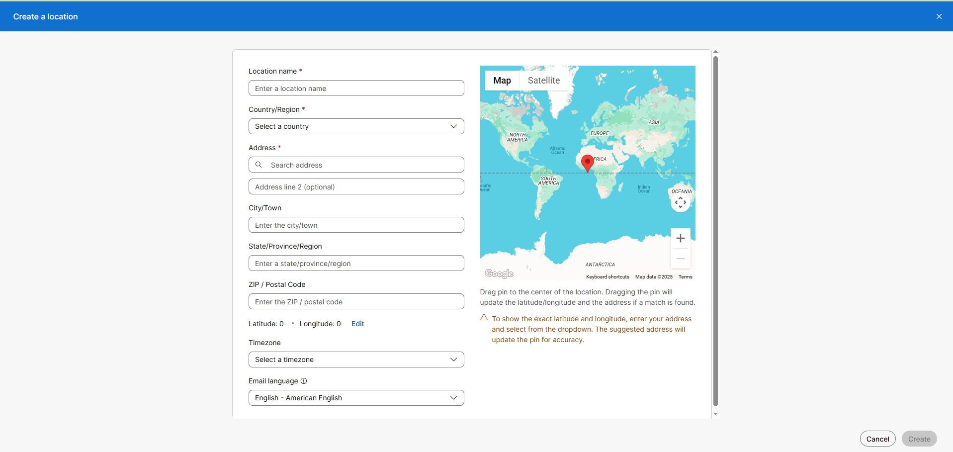 | 3. | Enter the details of the location and then click Create. |
