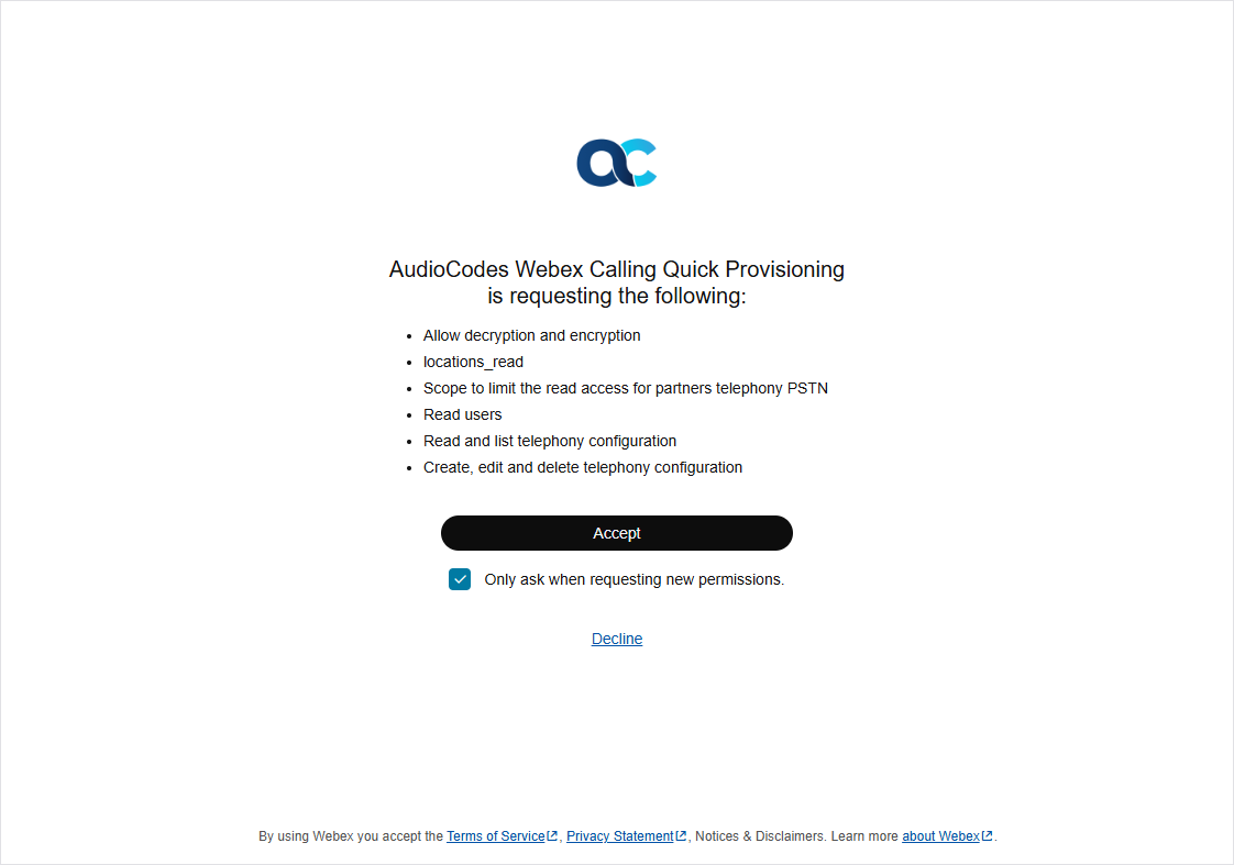 For this purpose, the customer must consent to allow the following permissions on their Webex Cloud Connect organization: