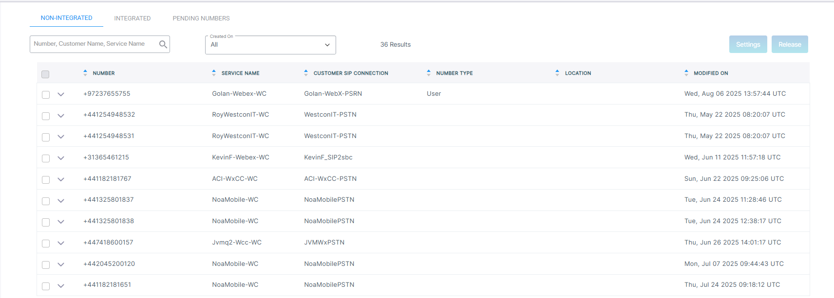 Non-integrated: Numbers that youhave loaded directly to Webex Cloud Connect organization and then the customer uploads from their Service portal. |