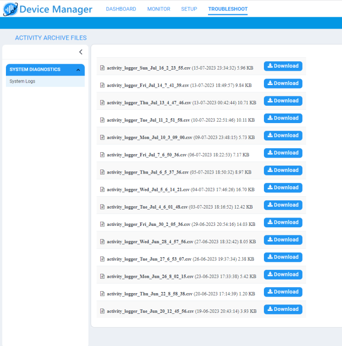 In Live Cloud Device Manager, open the System Logs page (Troubleshoot > System Diagnostics > System Logs). |