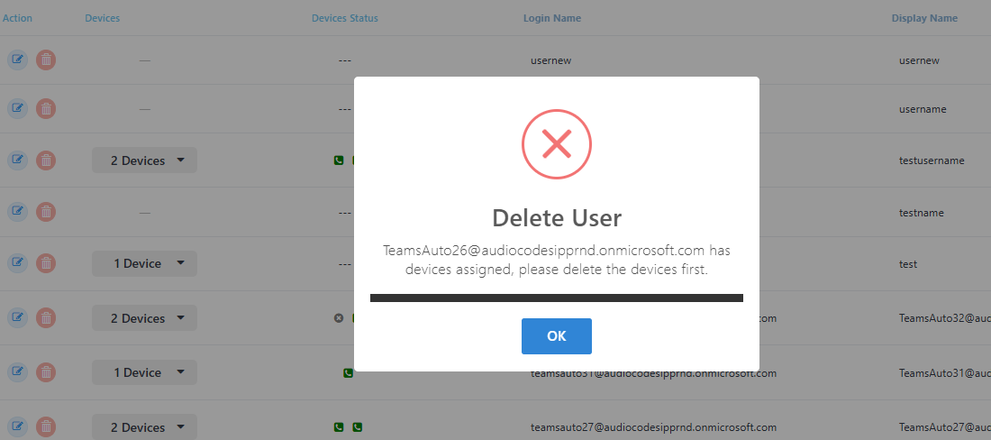 Click Delete to confirm. If the user is deleted unless multiple devices are assigned. Otherwise, a message instructs you to delete the devices first. |