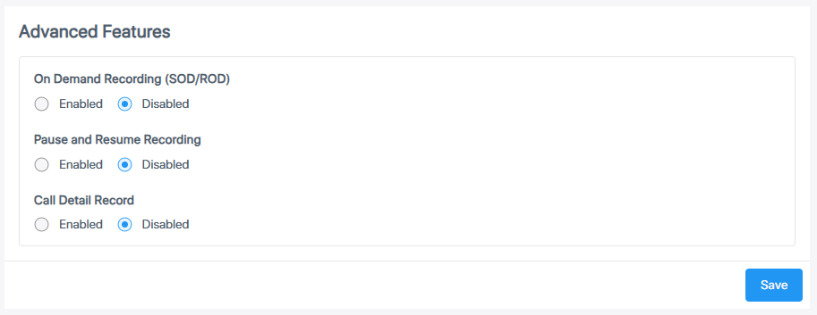 The Advanced features tab lets you enable On Demand Recording features for the tenant service including Save-on-Demand (SOD), Record-on-Demand (ROD) and Pause and Resume functionality.