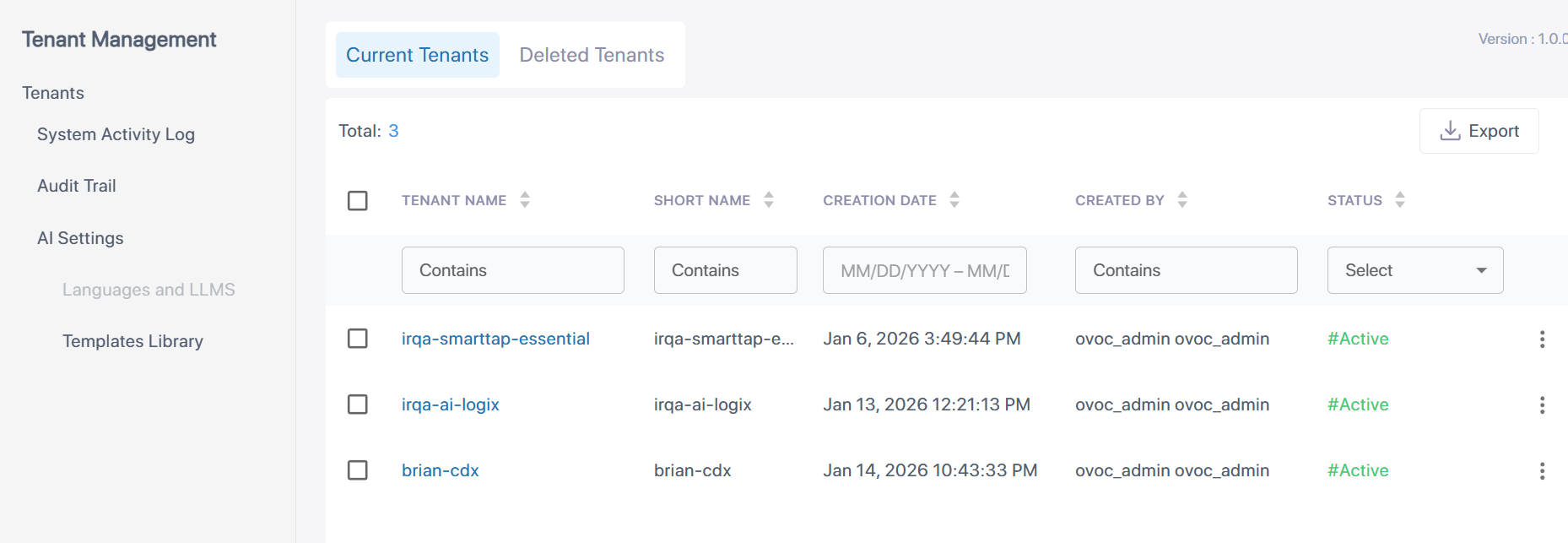 The Tenant Management page is displayed.