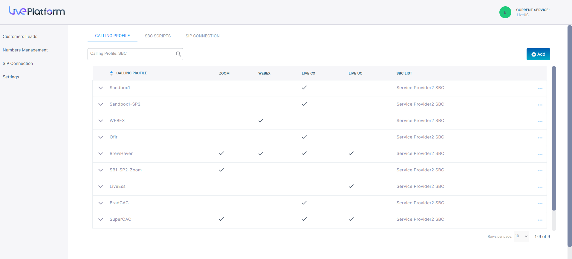 The Calling Profile screen lets you manage Calling Profiles that are configured in Live Platform. System users can also attach managed SBC devices to Calling Profiles. Calling Profiles represent logical containers for trunks and emergency strings that are used for outbound routing and emergency calling configurations. You can also configure CAC Profiles that are used for managing the number of concurrent calls for your customer at the SIP Connection level and for phone numbers routed through these connections. At least one calling profile is per region. Every number is associated with a single calling profile. When the Calling Profile is assigned to a service, links are created between the service and the SBC. Calling profiles are configured by AudioCodes Professional Services.