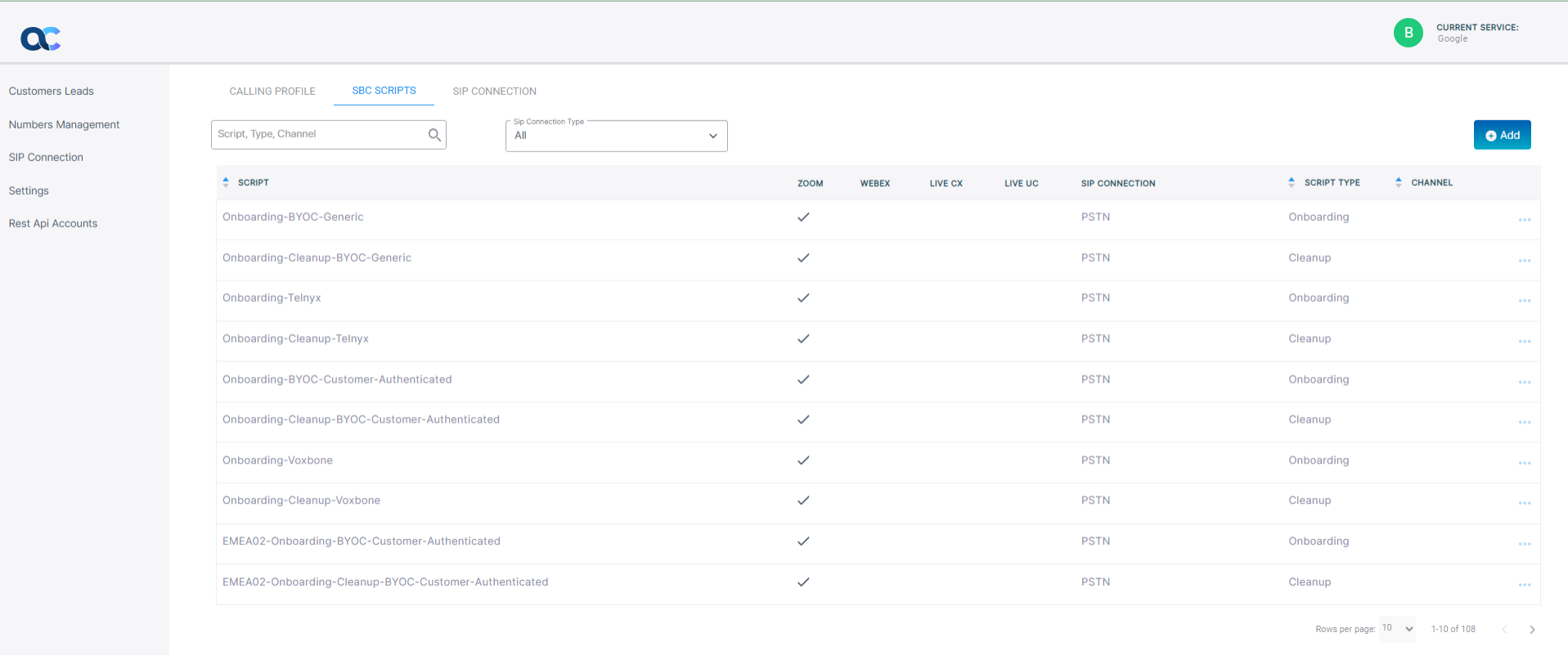 The Scripts page lets you view a list of the SBC scripts that are deployed for the managed CX service and add new scripts.