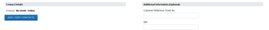 Your login name and contact email should appear here. You can also add additional contacts from the existing customer database, or a new contact on a one-time basis for this ticket.