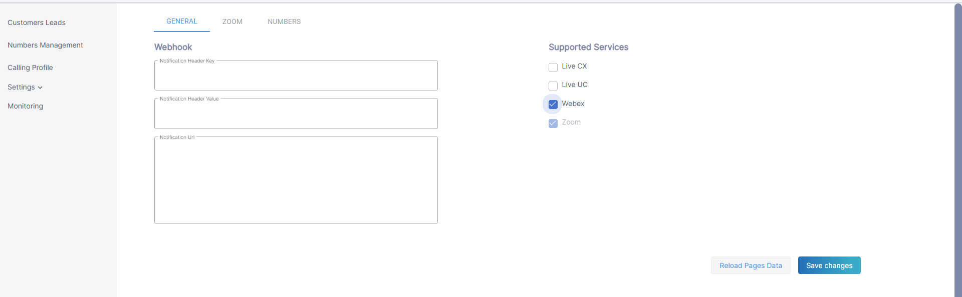 5. Under Supported Services, select Webex Cloud Connect and then click Save Changes. You can also click Reload Pages Data to refresh the page for the specific UCaaS service provider configuration.