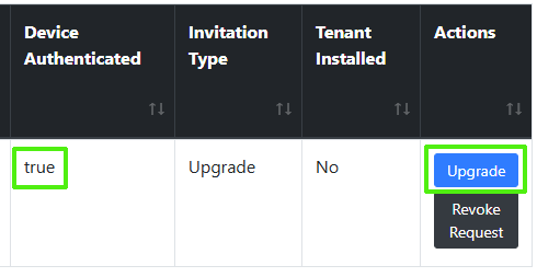 Verify in the Multitenant portal Pending Invitations page (Monitoring > Service > Pending Invitations) that the connection is authenticated; verify that the 'Device Authenticated' value is true, and then click Upgrade. |
