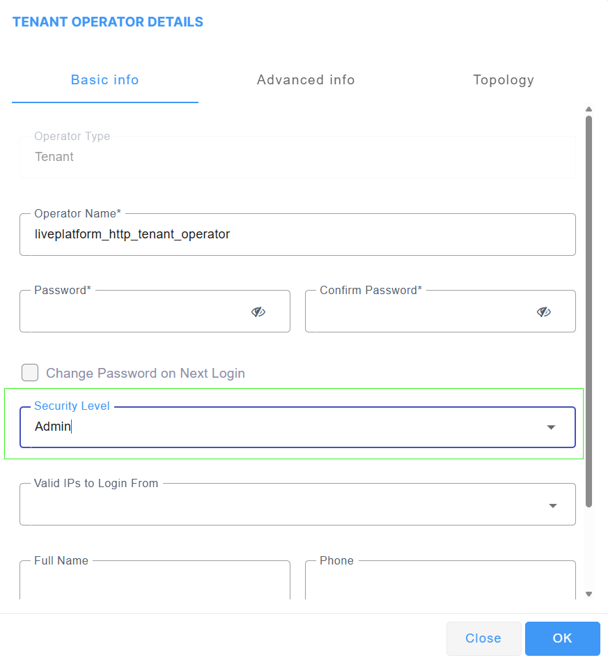 From the Security Level drop-down, select Admin and then click OK. |