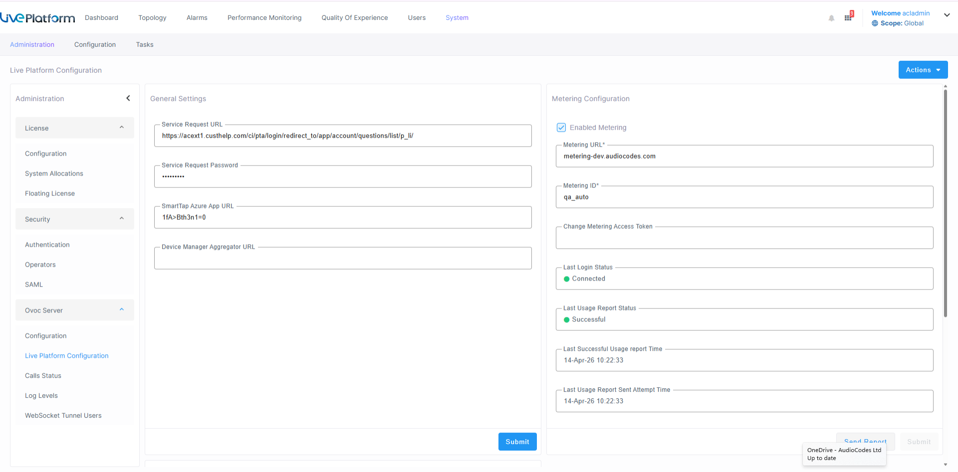 1. Open the Live Platform Configuration page (System menu > Administration tab > Ovoc Server folder >  Live Platform Configuration).