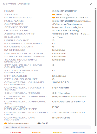 Summary of Active Alarms for the service (click to drill down to Service alarms). See Monitoring Alarms from Customer Service Sites.