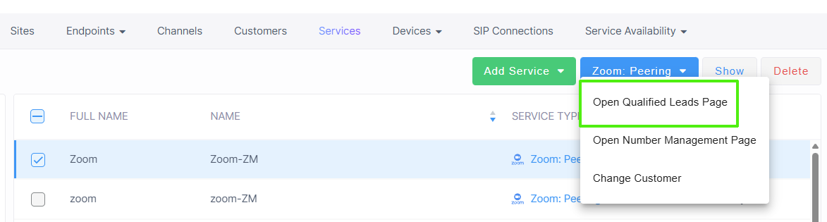 | 1. | Open the Qualified Leads page (in the Services page from the Zoom Peering drop-down, choose Open Qualified Leads page). |