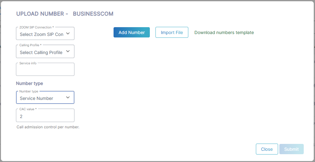 This procedure describes how to upload numbers to the Zoom service directly from the Live Platform Management portal.