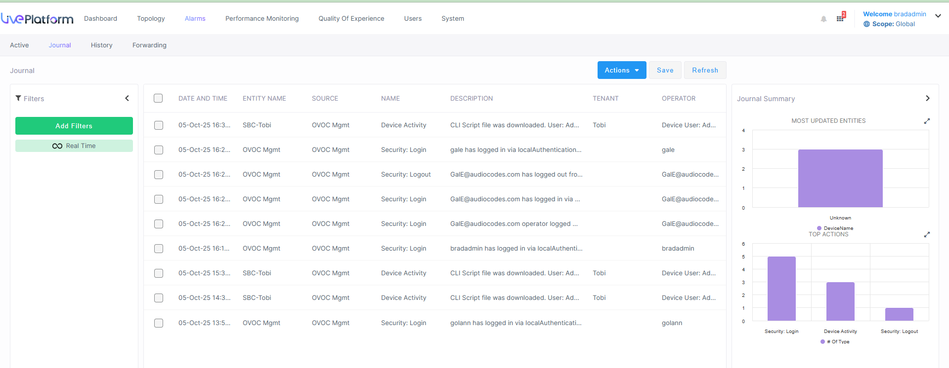 Any activity performed on the OVOC is captured and displayed in the Journals Alarms page, including the source IP of the user. This applies to all actions performed by OVOC administrators such as logging in, changing password, or creating new users. For some events, the status update states reported. For example, when changing user Security level from 'Admin' to 'Monitor' both the original level and the updated level are reported.