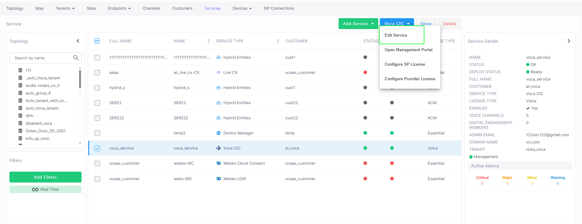 | 1. | In the Services page, select the check box adjacent to the service that you wish to edit and then from the Voca CIC drop-down, choose Voca CIC > Edit Service. |