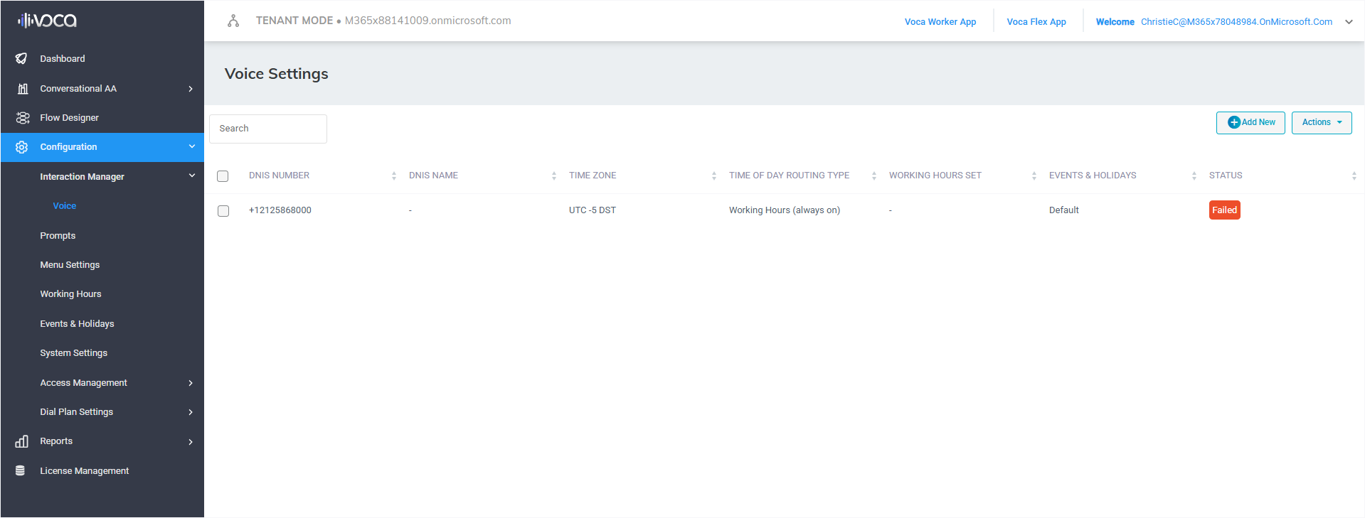 | 3. | Open the Management portal (see Day Two Management using Management Portal (Tenant Mode) to view the DNIS Number that you configured in the Onboarding form. You can upload this number to Live Platform when configuring SIP connections (see Establishing SIP Connections between Voca CIC and other Calling services). |