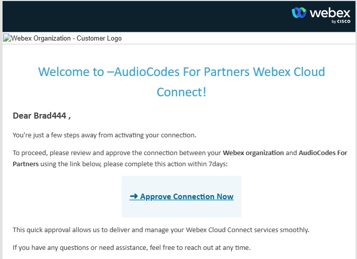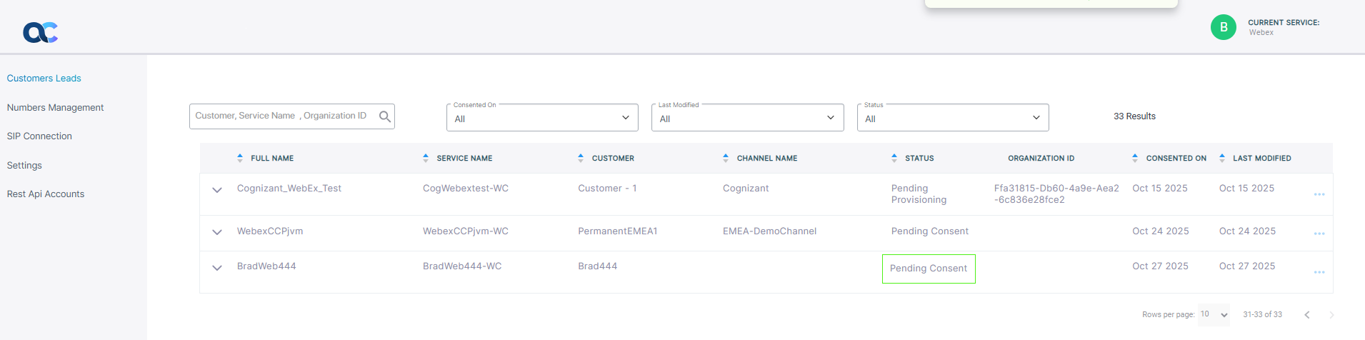 You can onboard a Webex Cloud Connect service by sending a email to the customer tenant admin account including a link to a Token invitation wizard . They must then login to their Webex Cloud Connect platform and consent to allow access to their platform. Once consent is provided, locations added on Webex are synced to Live Platform and numbers that you upload to the customer tenant on Live Platform are automatically synced to the customer Webex Cloud Connect organization.