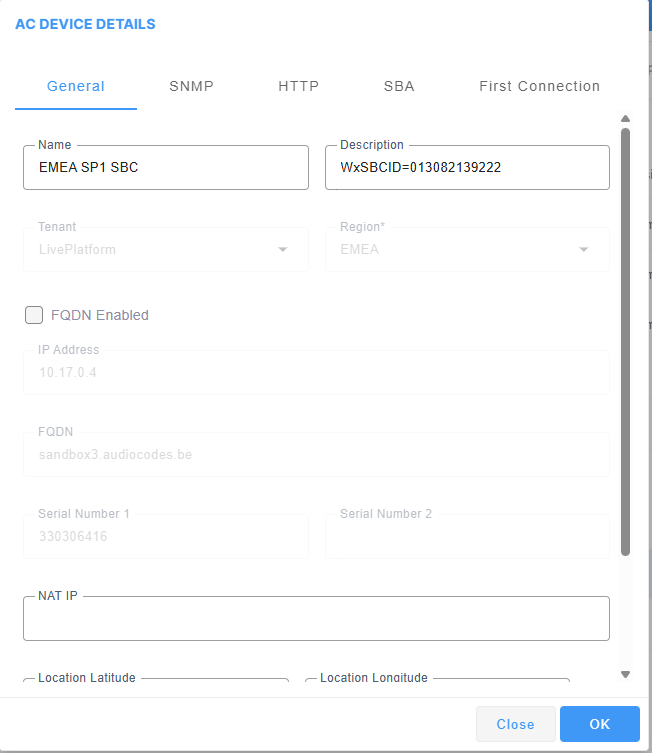 | ■ | In the AC Device Details General tab Description field, enter the Webex SBC ID value. This value is extracted from the Public IP address of the SBC device. For example, IP address 13.82.139.222 is translated to WxSBCID=013082139222: |