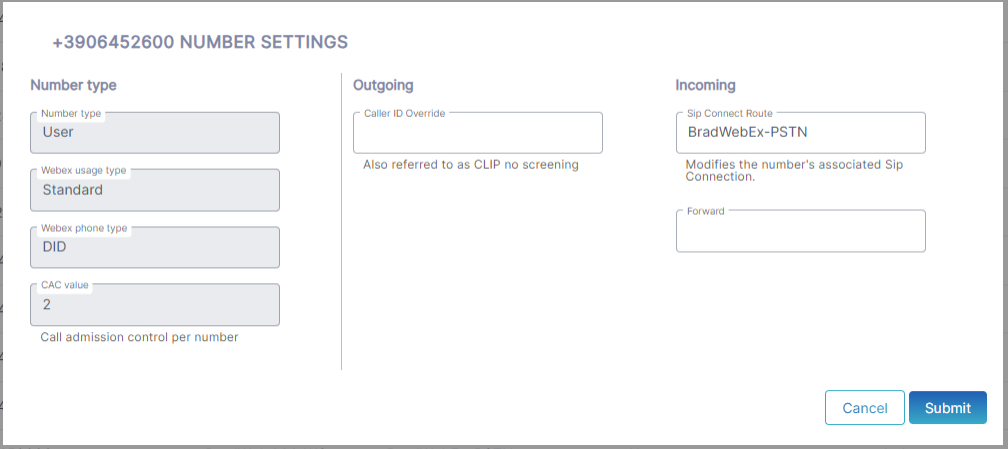 The table below describes the number type and CAC value for Webex Cloud Connect services.