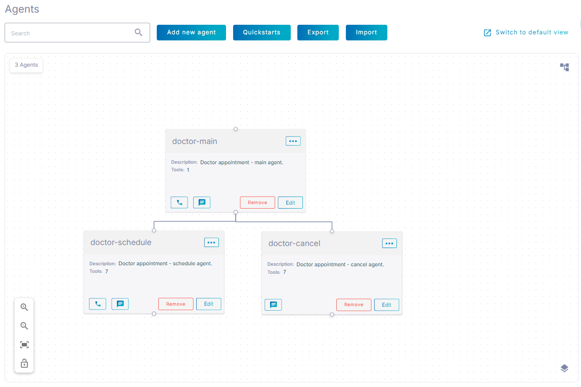 Alternatively, you may switch to canvas view and draw connections between agent cards. Each connection represents an entry in sub-agents table of the corresponding parent agent.
