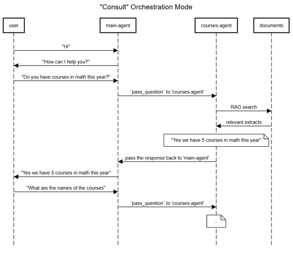 In consult orchestration mode, all communication with user is handled by the “main” agent.