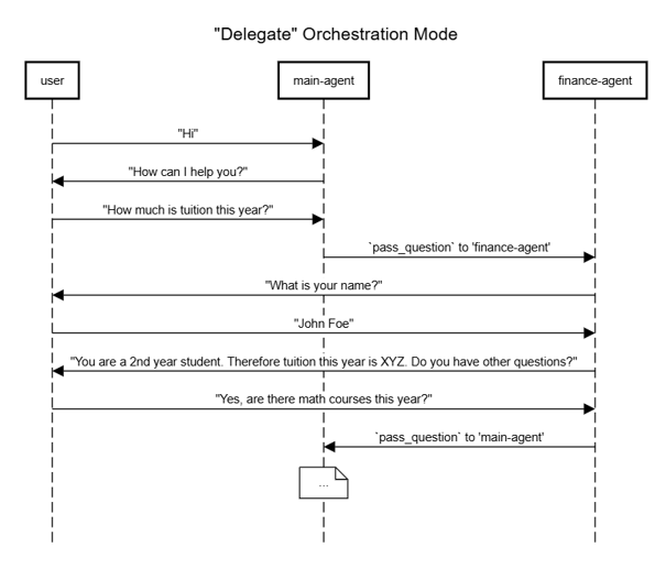 In delegate orchestration mode, once the question / message is passed to another agent “control” stays there – allowing other agent to reliably handle follow-up conversation with the user as it sees fit. The “control” may be passed to the “main” / other agent upon explicit call to pass_question / send_message tools by the “currently active” agent.
