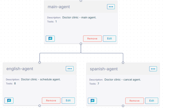 Main agent starts the conversation. Once it detects the spoken language, it passes the conversation to English or Spanish agent accordingly. The latter updates the conversation’s language and voice via the corresponding session parameters.