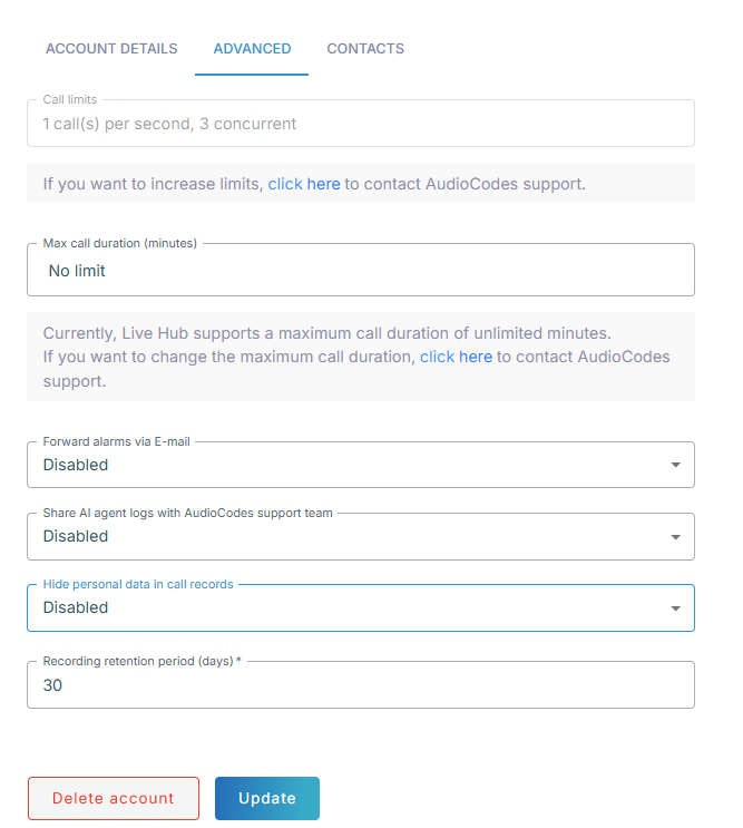 You can also configure maximum call duration per bot (see Edit your bot connection), SIP connection (see Create a Generic SIP connection), phone number (seeEdit a phone number), and Teams connection (see Create a Teams connection). However, they can't exceed the maximum call duration configured for your account (described in this section). For example, if you configure a maximum call duration of 30 minutes for your account, 40 minutes for a specific bot, and 10 minutes for a specific phone number, Live Hub applies a maximum call duration of 30 minutes to the bot and 10 minutes to the phone number.