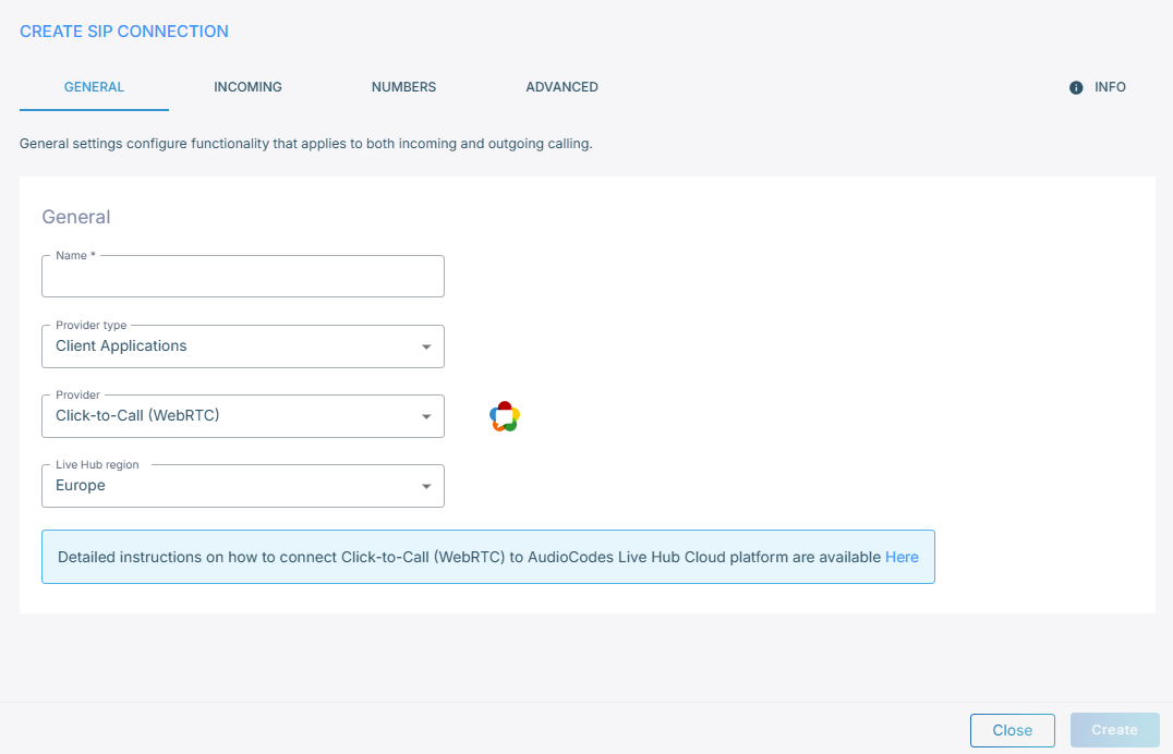 From the 'Provider' drop-down list, select Click-to-Call (WebRTC).