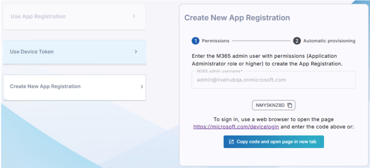 After you do one of the above, the Tenant Activation page opens. Click one of the three options to proceed: Use App Registration, Use Device Token, or Create New App Registration.