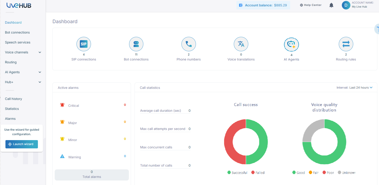 The Live Hub Dashboard is the default screen that provides an at-a-glance view of system status and performance metrics, enabling you to monitor and manage your communication services efficiently.