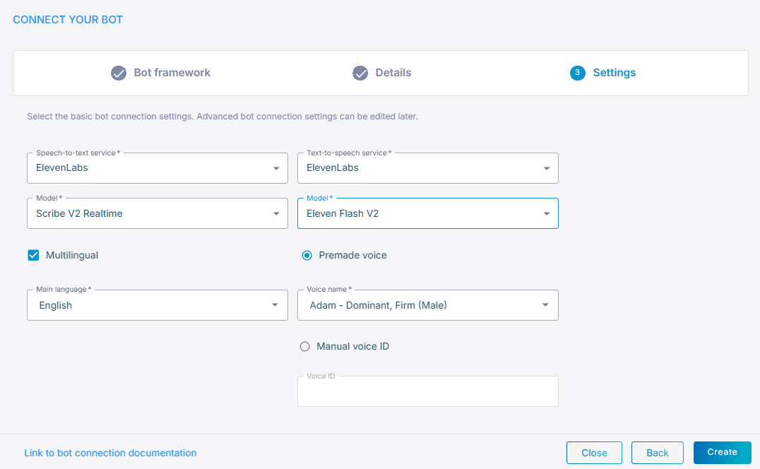 Refer to the sections below for instructions on configuring your text‑to‑speech service. When done, click Create; the new bot connection is created.