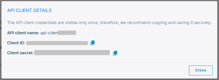 Click Create API client.A client ID and client secret is displayed. Keep this for future use for making a outbound request.