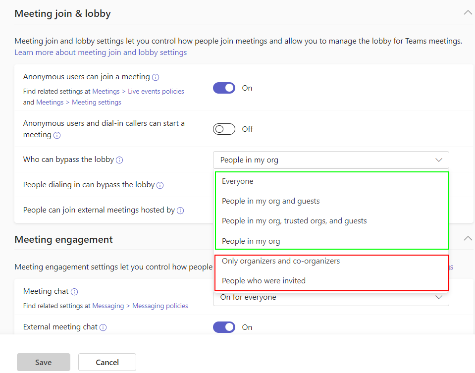 | ● | When the meeting policy settings indicated in green (below) are configured, MIA will bypass the meeting lobby of users assigned to this policy. |