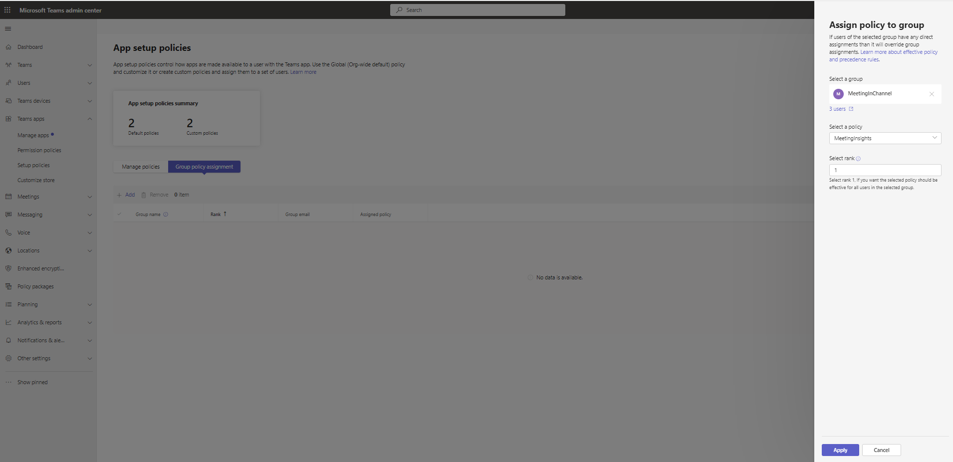 To apply to a group, create a separate policy, add the Meeting Insights Teams app to the installed and pinned apps, and then assign group(s) as shown below. |