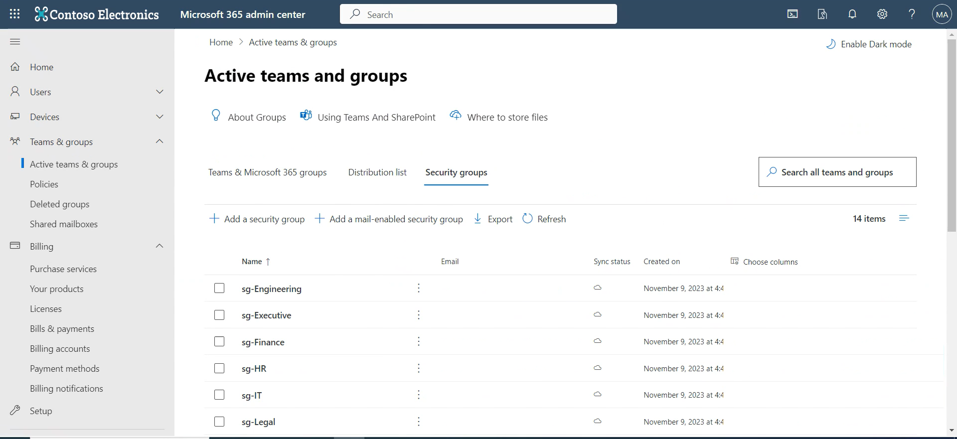 | 11. | Click Close. View the newly created mail-enabled security group listed in the 'Active teams and groups' page: |